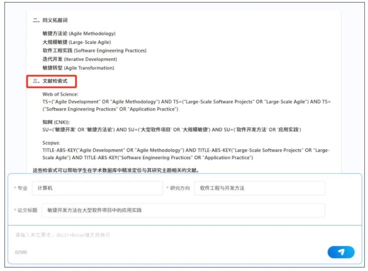 只需輸入專業(yè)、研究方向、論文標(biāo)題,即可智能生成文獻(xiàn)檢索式,覆蓋多個(gè)學(xué)術(shù)數(shù)據(jù)庫,確??焖佾@取最相關(guān)的文獻(xiàn)資源,節(jié)省大量時(shí)間,提升檢索效率。