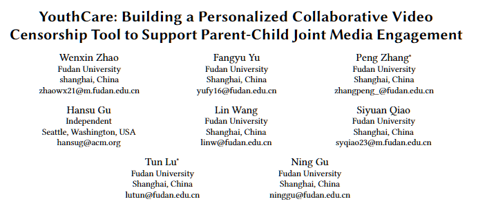 日前,實(shí)驗(yàn)室博士生趙雯欣作為第一作者的論文“YouthCare: Building a Personalized Collaborative Video Censorship Tool to Support Parent-Child Joint Media Engagement”被 CCF A類會(huì)議The ACM CHI Conference on Human Factors in Computing Systems (CHI) 會(huì)議錄用。該論文是復(fù)旦計(jì)算機(jī)學(xué)院與社會(huì)發(fā)展與公共政策學(xué)院社會(huì)工作學(xué)系跨學(xué)科研究團(tuán)隊(duì)AI4SS(AI for Social Science)的最新研究成果。