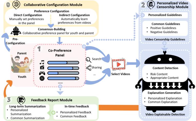 考慮到這些問(wèn)題和挑戰(zhàn),我們的目標(biāo)是設(shè)計(jì)一個(gè)自動(dòng)化的視頻審查系統(tǒng),以促進(jìn)父母和孩子在聯(lián)合媒體參與(JME)中共同篩選不適當(dāng)內(nèi)容并選擇合適內(nèi)容。本研究的對(duì)象為8-15歲之間的青少年。首先,通過(guò)問(wèn)卷和半結(jié)構(gòu)化訪談,我們探索了他們對(duì)視頻審查系統(tǒng)的需求和期望,并確定了五個(gè)設(shè)計(jì)目標(biāo)。基于這些目標(biāo),我們?cè)O(shè)計(jì)了YouthCare,一個(gè)個(gè)性化的協(xié)作視頻審查系統(tǒng),旨在幫助父母和孩子在聯(lián)合媒體參與中共同篩選不適當(dāng)內(nèi)容并選擇合適內(nèi)容。我們招募了10對(duì)父母和孩子來(lái)使用并評(píng)估該系統(tǒng)。結(jié)果表明,YouthCare在滿足用戶需求方面表現(xiàn)良好,且用戶對(duì)其接受度高,愿意繼續(xù)使用?;谶@些發(fā)現(xiàn),我們?yōu)槲磥?lái)親子協(xié)作JME系統(tǒng)的設(shè)計(jì)提供了新的見(jiàn)解。