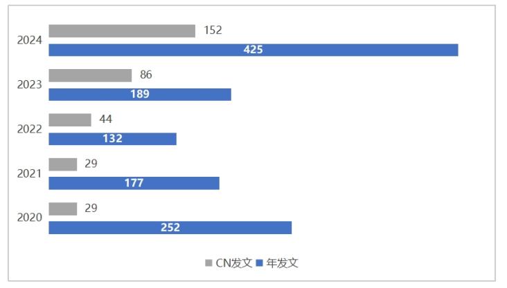 EI數(shù)據(jù)庫的檢索結(jié)果顯示,Engineering Reports期刊的年發(fā)文量保持了一定的穩(wěn)定性,并且較23年,其年發(fā)文量在2024年有顯著增長。中國學(xué)者在其中的貢獻(xiàn)比例適中,約占28%,期刊對中國學(xué)者的優(yōu)秀研究成果持開放和歡迎態(tài)度。