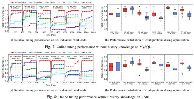 A-Tune-Online 是一種面向動(dòng)態(tài)工作負(fù)載的在線配置調(diào)優(yōu)系統(tǒng),能夠同時(shí)實(shí)現(xiàn)高性能、高效率和 QoS 保障。該系統(tǒng)通過(guò)多階段負(fù)載突變檢測(cè)(結(jié)合規(guī)則和重放檢測(cè)器)精準(zhǔn)識(shí)別工作負(fù)載變化,并觸發(fā)優(yōu)化重啟以避免歷史不相關(guān)數(shù)據(jù)的干擾。為提高重啟后的優(yōu)化效率,它采用熱啟動(dòng)技術(shù),利用回歸模型匹配歷史相似負(fù)載并復(fù)用其配置或代理模型知識(shí)。此外,系統(tǒng)通過(guò)維護(hù)安全區(qū)域并優(yōu)先推薦預(yù)期改進(jìn)最優(yōu)的配置來(lái)確保 QoS。實(shí)驗(yàn)表明,A-Tune-Online 在多種場(chǎng)景下均能準(zhǔn)確檢測(cè)負(fù)載變化、快速適應(yīng)新負(fù)載,并提供比現(xiàn)有系統(tǒng)更優(yōu)的配置推薦和 QoS 保障。