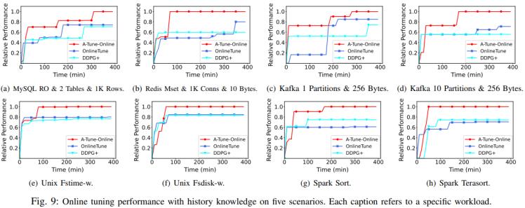 如圖3,在有歷史知識(shí)的情況下,實(shí)驗(yàn)進(jìn)一步驗(yàn)證了各方法利用先驗(yàn)信息的能力。預(yù)先使用標(biāo)準(zhǔn)BO為每個(gè)場(chǎng)景構(gòu)建歷史數(shù)據(jù)庫(kù)后,A-Tune-Online展現(xiàn)出更快的收斂速度。在涵蓋MySQL、Redis等五大場(chǎng)景的測(cè)試中,該系統(tǒng)相比OnlineTune和DDPG+分別實(shí)現(xiàn)了2.86%-13.20%和4.68%-13.18%的性能提升。特別值得注意的是,在Spark任務(wù)中僅用5次迭代就找到近優(yōu)配置,證明其相似任務(wù)匹配機(jī)制的有效性。效率指標(biāo)顯示,達(dá)到相同性能水平時(shí),A-Tune-Online平均比OnlineTune快2.9倍,比DDPG+快1.72倍。這些結(jié)果充分說(shuō)明,系統(tǒng)設(shè)計(jì)的雙重?zé)釂?dòng)策略能智能區(qū)分負(fù)載相似度,在保證安全性的前提下最大化歷史知識(shí)的價(jià)值。