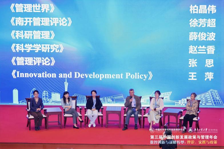 本次會議設(shè)置了13場主旨報告、15個平行分論壇和6家期刊見面會。中國科學學與科技政策研究會理事長穆榮平教授、中國科學技術(shù)發(fā)展戰(zhàn)略研究院胡志堅教授、廣東工業(yè)大學劉強教授、上海交通大學李垣教授、中國科學院大學柳卸林教授、華南理工大學朱桂龍教授、中國科學院大學陳凱華教授、中國科學院科技戰(zhàn)略咨詢研究院余江研究員、清華大學周源副教授、哈爾濱工程大學蘇屹教授、北京師范大學焦豪教授、同濟大學解學梅教授、中國科學院科技戰(zhàn)略咨詢研究院郭京京研究員應邀作主旨報告。在平行論壇環(huán)節(jié),240余位作者匯報了學術(shù)論文,60余位優(yōu)秀學者擔任主持和點評人,討論涵蓋數(shù)智創(chuàng)新與轉(zhuǎn)型、創(chuàng)新發(fā)展的中國模式、創(chuàng)新網(wǎng)絡與創(chuàng)新生態(tài)系統(tǒng)、科技創(chuàng)新政策與平臺支撐、政策組合與創(chuàng)新發(fā)展、創(chuàng)新鏈人才鏈與產(chǎn)業(yè)鏈融合發(fā)展、數(shù)智賦能戰(zhàn)略轉(zhuǎn)型、數(shù)智賦能產(chǎn)業(yè)高質(zhì)量發(fā)展、數(shù)綠協(xié)同創(chuàng)新發(fā)展、數(shù)智人才發(fā)展與創(chuàng)新、數(shù)據(jù)要素市場化與倫理治理、數(shù)智化與治理體系現(xiàn)代化等前沿議題。在期刊見面會上,《管理世界》《南開管理評論》《科研管理》《科學學研究》《管理評論》《Innovation and Development Policy》等期刊的代表與參會學者展開深入交流,詳細解讀期刊的辦刊理念、選題方向及投稿規(guī)范,為學者們提供了寶貴的學術(shù)發(fā)表指導。
