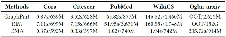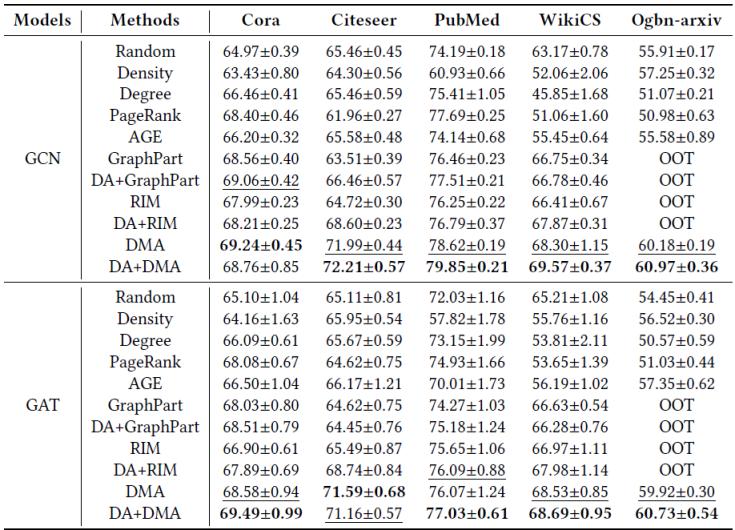 1.  節(jié)點(diǎn)分類任務(wù)上的性能對比,OOT代表超時(Out of Time)