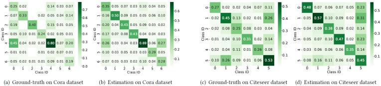 為了驗(yàn)證DMA中噪聲估計模塊的有效性,我們對其預(yù)測的LLM標(biāo)注噪聲分布進(jìn)行了可視化分析。圖5分別展示了Cora和Citeseer數(shù)據(jù)集上的估計噪聲分布,同時提供真實(shí)噪聲分布作為對比基準(zhǔn)。圖5顯示,估計結(jié)果基本反映了真實(shí)噪聲分布的核心模式,這一現(xiàn)象解釋了表1中DMA優(yōu)于基線模型的性能表現(xiàn)。然而,估計分布與真實(shí)分布之間仍存在差異:例如在Cora數(shù)據(jù)集上,噪聲估計模塊認(rèn)為第5類節(jié)點(diǎn)的錯誤標(biāo)注概率為0.29,而其真實(shí)誤標(biāo)概率僅為0.07。這些偏差表明,未來需要進(jìn)一步改進(jìn)LLM標(biāo)注噪聲分布的估計精度。