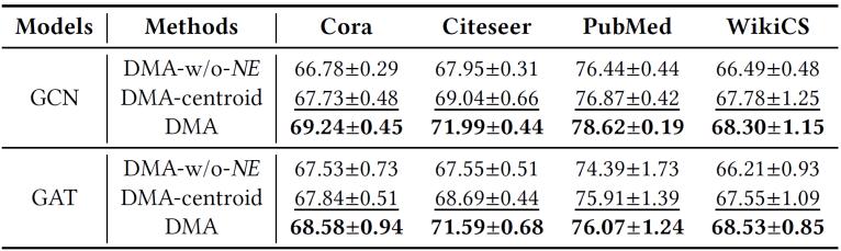 我們提出的DMA框架最核心的貢獻(xiàn)在于:其噪聲估計模塊以數(shù)據(jù)集可感LLM可感的方式,顯式建模了LLM的標(biāo)注噪聲分布。為驗(yàn)證該模塊是否如預(yù)期提升了最終性能,我們設(shè)計了以下實(shí)驗(yàn):定義兩種DMA變體——1"DMA-w/o-NE"將噪聲估計模塊中的預(yù)測噪聲分布替換為均勻分布,通過將均勻噪聲率從0.10.5網(wǎng)格搜索后取最高測試精度作為最終性能;2"DMA-centroid"采用節(jié)點(diǎn)特征經(jīng)K-Means聚類生成的質(zhì)心嵌入作為類別表示(假設(shè)該變體可利用真實(shí)標(biāo)簽對齊質(zhì)心與真實(shí)類別以保證可行性)。2的實(shí)驗(yàn)結(jié)果表明:完整版DMA在所有評估配置下均優(yōu)于兩種變體。DMA相對DMA-w/o-NE的性能優(yōu)勢,證實(shí)了噪聲估計模塊預(yù)測標(biāo)注噪聲分布的有效性;而DMA相對DMA-centroid的優(yōu)越性,則源于其與LLM對數(shù)據(jù)集認(rèn)知的更好對齊,這凸顯了以數(shù)據(jù)集可感LLM可感方式建模噪聲分布的重要性。