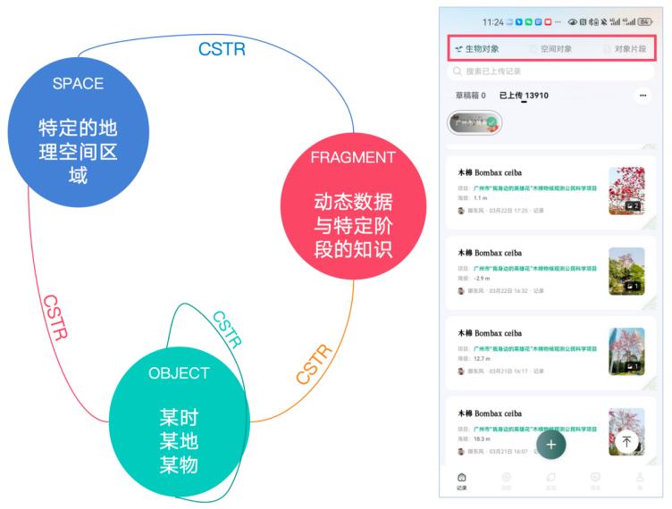 圖3 “空間-實(shí)體-片段”模型(SOF模型)以及基于SOF模型的生命網(wǎng)格APP生物多樣性與生態(tài)數(shù)據(jù)采集功能