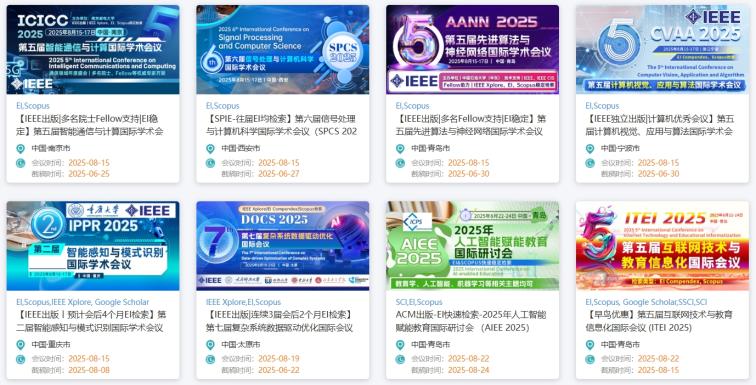 2025年8月熱門學(xué)術(shù)會議推薦,覆蓋復(fù)合醫(yī)學(xué)工程、計算機(jī)科學(xué)、區(qū)塊鏈、虛擬現(xiàn)實、信號處理、計算建模、應(yīng)用數(shù)學(xué)、遙感技術(shù)、圖像處理、可持續(xù)發(fā)展、能源資源、商業(yè)生成式人工智能、飛行器控制、導(dǎo)航技術(shù)、無線通信、智能電網(wǎng)、精密儀器、光學(xué)工程、物聯(lián)網(wǎng)、云計算技術(shù)、納米技術(shù)、電子電氣工程、自動控制、先進(jìn)制造技術(shù)、機(jī)械、航天技術(shù)、材料應(yīng)用、互聯(lián)網(wǎng)金融、數(shù)字經(jīng)濟(jì)、教育創(chuàng)新、信息技術(shù)、自然語言處理、神經(jīng)網(wǎng)絡(luò)、能源技術(shù)、電氣工程、生物醫(yī)藥、計算機(jī)應(yīng)用、模式識別、固體力學(xué)、清潔能源、電力工程、數(shù)據(jù)驅(qū)動、藝術(shù)、教育、現(xiàn)代管理、社會科學(xué)、互聯(lián)網(wǎng)技術(shù)、智能交通系統(tǒng)、氣候韌性、低碳城市、信息安全、遙感與航空航天、數(shù)據(jù)挖掘、電力電網(wǎng)、電氣工程、工程機(jī)械、車輛工程、地球物理、勘探開發(fā)、數(shù)字創(chuàng)意設(shè)計、生成式AI、文化產(chǎn)業(yè)、數(shù)字化社會、機(jī)電一體化、激光、光學(xué)技術(shù)、能源材料等多主題,提供交流機(jī)會。會議涵蓋全國各地,詳情見各會議官網(wǎng)。點擊獲取更多學(xué)術(shù)會議資訊!