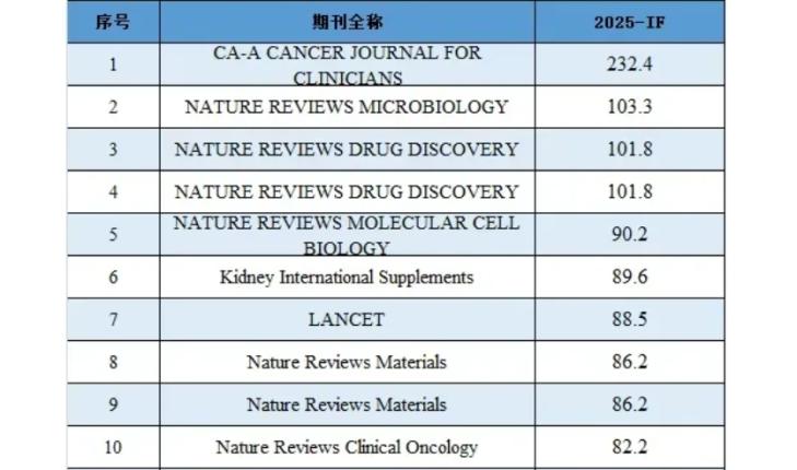 部分展示:2025年度影響因子排名TOP10期刊如下:
