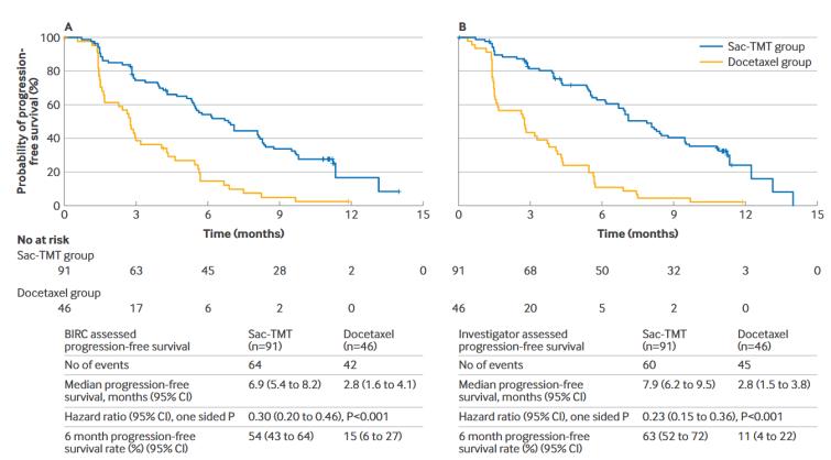 OptiTROP-Lung03研究是一項多中心、開放標簽、隨機對照II期臨床試驗,旨在比較蘆康沙妥珠單抗與多西他賽在既往接受過EGFR-TKI和鉑類化療失敗的晚期EGFR突變NSCLC患者中的療效和安全性。