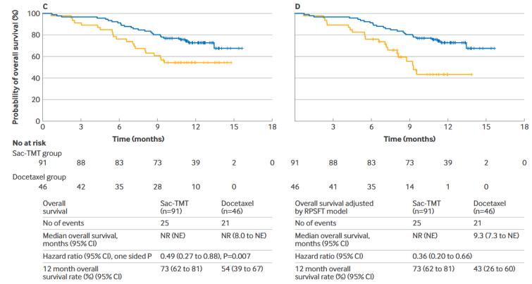 緊隨其后,2025年6月5日,OptiTROP-Lung03研究的更新結(jié)果重磅發(fā)布于《英國醫(yī)學雜志》。數(shù)據(jù)顯示,截至2024年12月31日,經(jīng)盲法獨立評審委員會(BIRC)評估,蘆康沙妥珠單抗組的客觀緩解率(ORR)高達45%,而多西他賽組僅為16%,差異達29%(P<0.001)。中位無進展生存期(PFS)方面,蘆康沙妥珠單抗組為6.9個月,多西他賽組僅為2.8個月,疾病進展或死亡風險顯著降低70%(HR 0.30,P<0.001)。在總生存期(OS)方面,蘆康沙妥珠單抗組和多西他賽組均未達到中位總生存時間,但蘆康沙妥珠單抗組已顯示出顯著的OS改善,死亡風險降低51%(HR 0.49,P=0.007),經(jīng)交叉校正后OS優(yōu)勢更為顯著(HR 0.36),死亡風險降低64%。