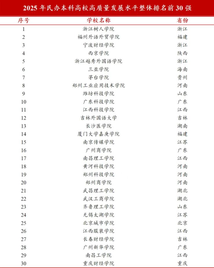 根據(jù)2025年民辦本科高校高質(zhì)量發(fā)展水平的整體排名情況,我國(guó)民辦本科高校高質(zhì)量發(fā)展水平前五強(qiáng)分別為:浙江樹人學(xué)院、福州外語(yǔ)外貿(mào)學(xué)院、寧波財(cái)經(jīng)學(xué)院、西京學(xué)院和浙江越秀外國(guó)語(yǔ)學(xué)院。