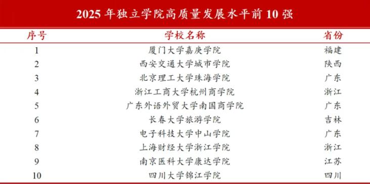 根據(jù)2025年我國(guó)獨(dú)立學(xué)院高質(zhì)量發(fā)展的排名情況,154所獨(dú)立學(xué)院中,高質(zhì)量發(fā)展水平前三強(qiáng)分別為:廈門大學(xué)嘉庚學(xué)院、西安交通大學(xué)城市學(xué)院和北京理工大學(xué)珠海學(xué)院。
