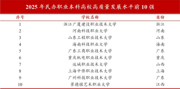 根據(jù)2025年民辦職業(yè)本科高校高質(zhì)量發(fā)展的排名情況,我國(guó)民辦職業(yè)本科高校高質(zhì)量發(fā)展水平前三強(qiáng)分別為:浙江廣廈建設(shè)職業(yè)技術(shù)大學(xué)、河南科技職業(yè)大學(xué)、山東工程職業(yè)技術(shù)大學(xué)。