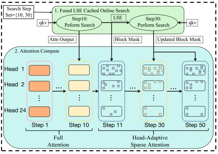具體來說,AdaSpa在預定義的搜索步驟 (Search Step Set) 利用自實現(xiàn)的高效的Fused LSE-Cached Online Search kernel進行精確搜索,在其他步驟復用這些精確范式進行稀疏注意力計算。 Fused LSE-Cached Online Search kernel將搜索與FlashAttention2耦合,在搜索步同時計算注意力輸出并緩存 LSE,后續(xù)搜索復用緩存,進一步減少搜索時間。其次,根據(jù)不同Head的稀疏度不同,我們引入 Head-Adaptive Block Sparse Attention,根據(jù)各Head召回率動態(tài)調(diào)整稀疏度以以提高精度并保證kernel的負載均衡。