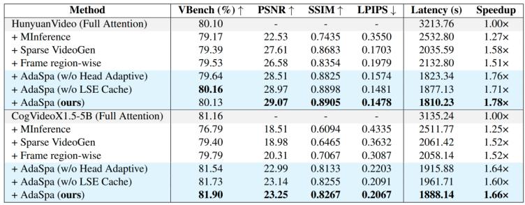 表1. AdaSpa和其他方法的質(zhì)量和延遲的定量評估結(jié)果