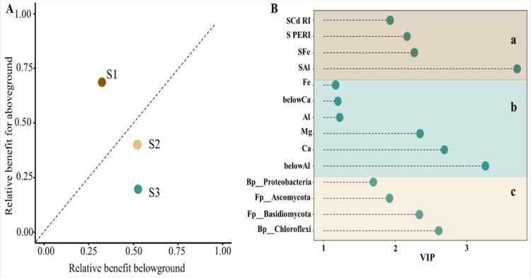 圖2. 重金屬風(fēng)險(xiǎn)下芒屬植物的地上地下權(quán)衡模式(A)及影響因素(B)