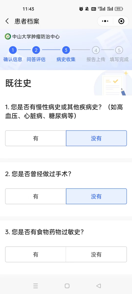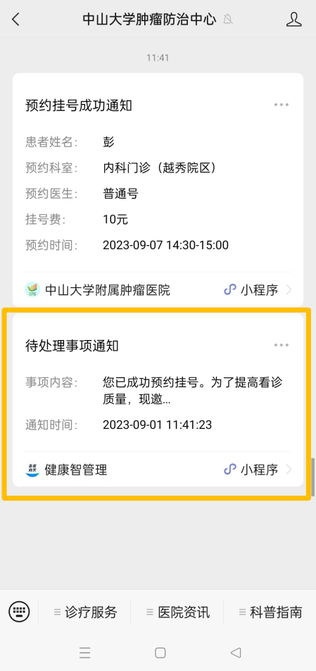 預(yù)約掛號(hào)成功后,中山大學(xué)腫瘤防治中心微信公眾號(hào)將為患者推送“待處理事項(xiàng)通知”,點(diǎn)擊后即可進(jìn)入智能預(yù)問診填寫界面