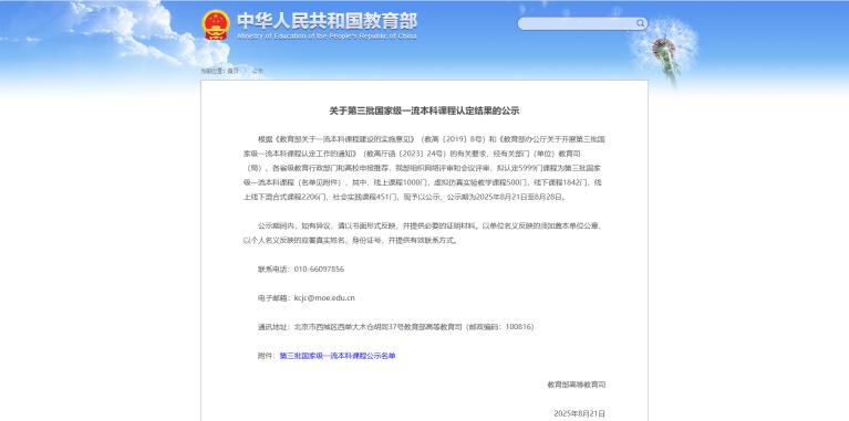 根據(jù)《教育部關(guān)于一流本科課程建設(shè)的實(shí)施意見(jiàn)》(教高〔2019〕8號(hào))和《教育部辦公廳關(guān)于開(kāi)展第三批國(guó)家級(jí)一流本科課程認(rèn)定工作的通知》(教高廳函〔2023〕24號(hào))的有關(guān)要求,經(jīng)有關(guān)部門(mén)(單位)教育司(局)、各省級(jí)教育行政部門(mén)和高校申報(bào)推薦,教育部組織網(wǎng)絡(luò)評(píng)審和會(huì)議評(píng)審,擬認(rèn)定5999門(mén)課程為第三批國(guó)家級(jí)一流本科課程,其中,線上課程1000門(mén),虛擬仿真實(shí)驗(yàn)教學(xué)課程500門(mén),線下課程1842門(mén),線上線下混合式課程2206門(mén),社會(huì)實(shí)踐課程451門(mén),現(xiàn)予以公示,公示期為2025年8月21日至8月28日。