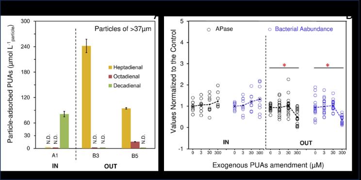 圖2:展示了藻華區(qū)內(nèi)和區(qū)外底層水中顆粒吸附態(tài)PUAs的原位監(jiān)測對比(A,藻際環(huán)境中的微摩爾級別水平),以及顆粒物附著細菌對微摩爾級PUAs受控實驗的響應(yīng)規(guī)律對比(B,包括堿性磷酸酶活性和細菌豐度)。