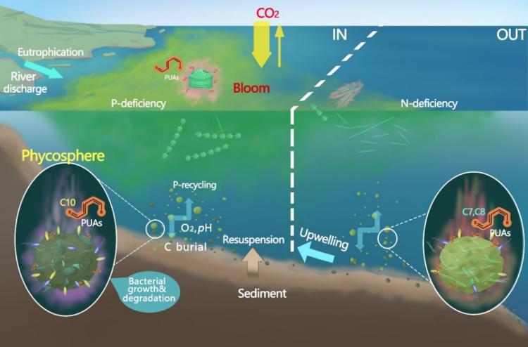 藻際環(huán)境下的顆粒附著細菌可以適應(yīng)硅藻(或其碎屑)釋放的高濃度PUAs,協(xié)同地維持高速的有機磷循環(huán)速率,支持近海的硅藻水華和凈生產(chǎn)力。這些過程導(dǎo)致的額外生物碳積累可能會增加近海二氧化碳吸收和pH值,從而對抗近海酸化和缺氧現(xiàn)象。因此,富含PUAs的硅藻與細菌之間的相互作用可能會影響全球各地河口近海的浮游植物藻華生消和碳封存(圖3)。本研究揭示了硅藻氧脂類代謝信號化合物在近海顆粒有機磷循環(huán)和藻華生消中的作用與調(diào)控機制,為大灣區(qū)海域生態(tài)環(huán)境的保護和全球富營養(yǎng)化磷限制近海藻華的管理提供了理論基礎(chǔ)。