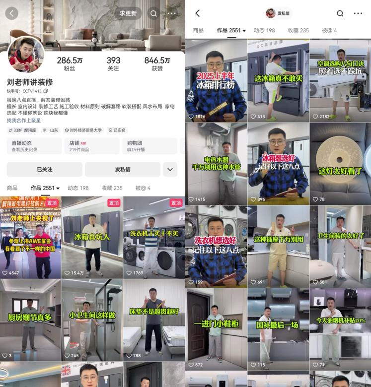 從線下裝修公司老板到擁有286.5萬(wàn)粉絲關(guān)注的快手家居主播,劉老師入局快手電商平臺(tái)6年,通過(guò)線下裝修工作和拆卸上百臺(tái)家電積累的專業(yè)知識(shí),在歷來(lái)被認(rèn)為“水很深”的裝修行業(yè),贏得了消費(fèi)者的信賴,每日雷打不動(dòng)的直播更成為了不少老鐵學(xué)習(xí)裝修知識(shí)、避免“踩坑”的“家裝智庫(kù)”。