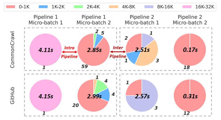 4. 流水線間 packing 不均衡(inter-pipeline packing imbalance):當(dāng)不同流水線處理的packed序列復(fù)雜度差異較大時(shí),最慢的流水線決定了整體迭代速度,從而拉低集群效率。