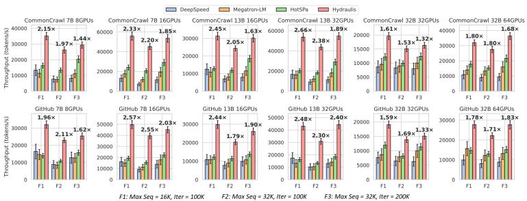 在LLaMA2 7B、13B和32B模型上,以CommonCrawl和GitHub兩個(gè)大規(guī)模數(shù)據(jù)集為基準(zhǔn),我們?cè)?4張Nvidia A800 GPU的集群中開展實(shí)驗(yàn)。結(jié)果顯示,Hydraulis相較于Megatron-LM、DeepSpeed和HotSPa,在端到端性能上提升1.32–2.66倍。進(jìn)一步實(shí)驗(yàn)表明,在 GPU 數(shù)量擴(kuò)展、最大序列長(zhǎng)度增大和batch size調(diào)整等不同條件下,Hydraulis均展現(xiàn)出良好的擴(kuò)展性和穩(wěn)定性。