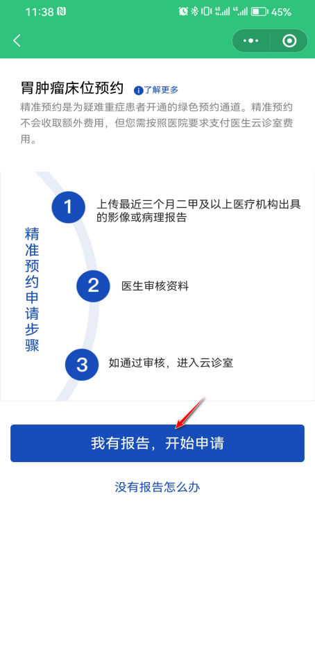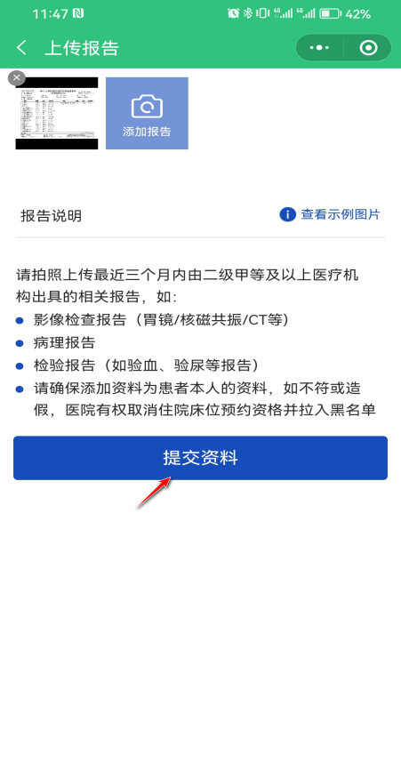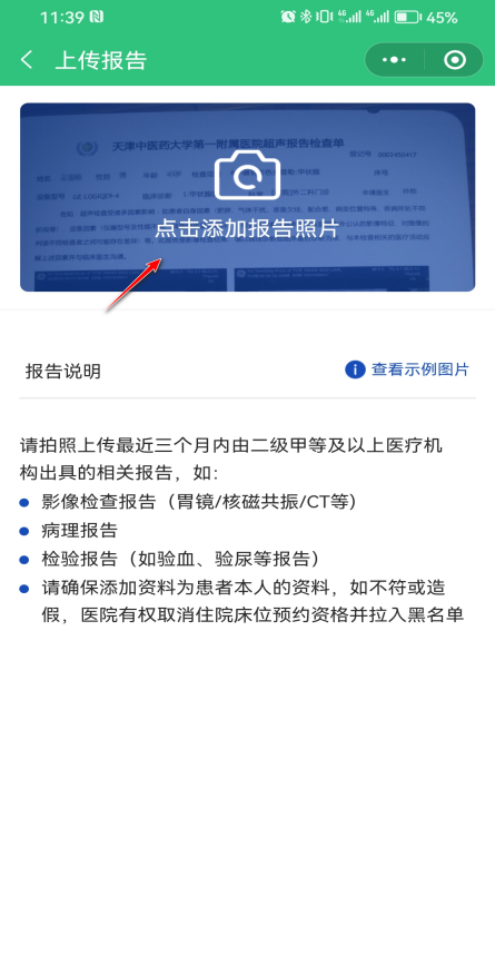 上傳【最近三個(gè)月二甲及以上醫(yī)院】出具的【影像、病理、檢驗(yàn)等報(bào)告資料】,等待系統(tǒng)智能判斷是否符合預(yù)約條件。