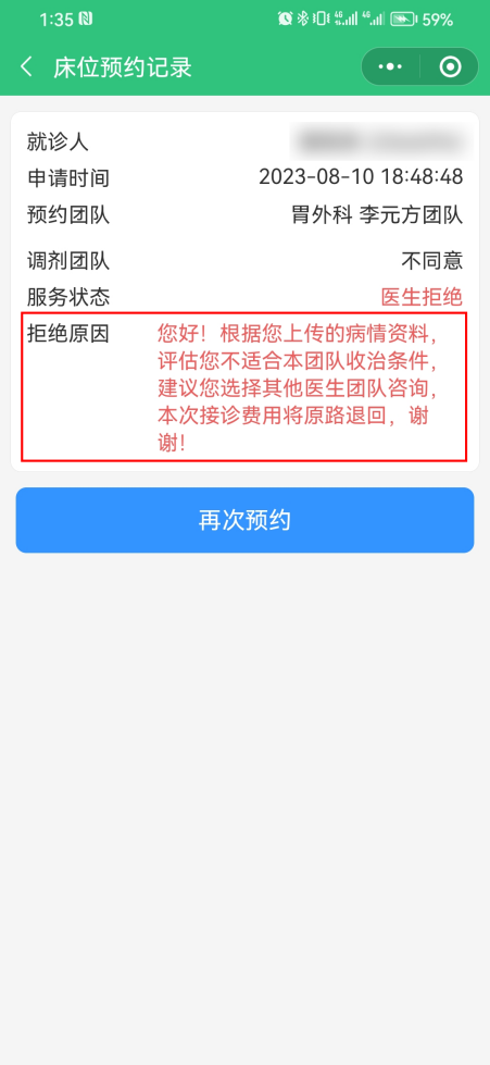 若相關(guān)資料不符合入院條件,系統(tǒng)將提示【預(yù)約失敗】,病友可查看回退原因,重新整理資料再次預(yù)約或到線下就診溝通。
