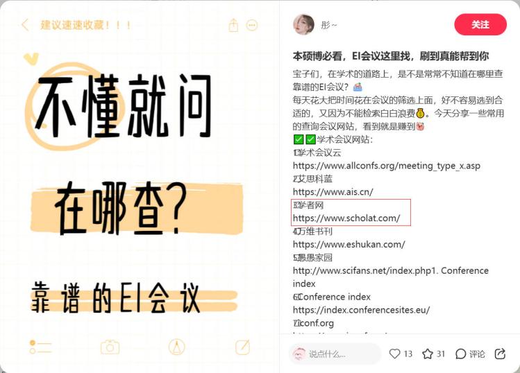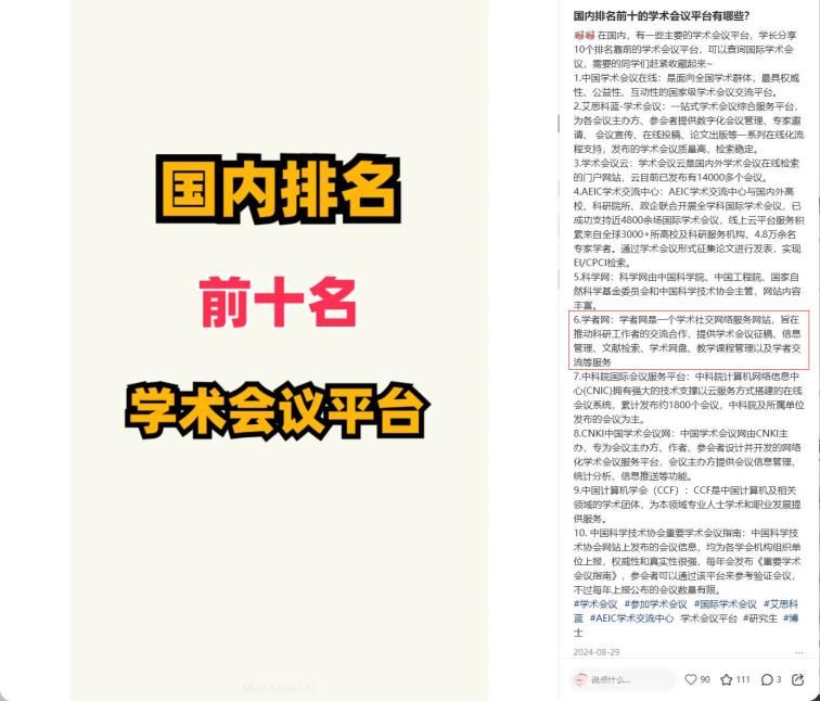在 小紅書 上,部分碩博用戶將學(xué)者網(wǎng)作為查找學(xué)術(shù)會(huì)議信息的工具。他們表示,通過學(xué)者網(wǎng)能夠更集中地獲取較為可靠的會(huì)議信息,在準(zhǔn)備論文或申請(qǐng)參會(huì)時(shí)減少了篩選成本。與此同時(shí),在一些學(xué)術(shù)會(huì)議平臺(tái)的盤點(diǎn)中,學(xué)者網(wǎng)被列入國內(nèi)前十的學(xué)術(shù)會(huì)議平臺(tái),顯示出學(xué)者網(wǎng)在學(xué)術(shù)信息服務(wù)領(lǐng)域的認(rèn)可度。
