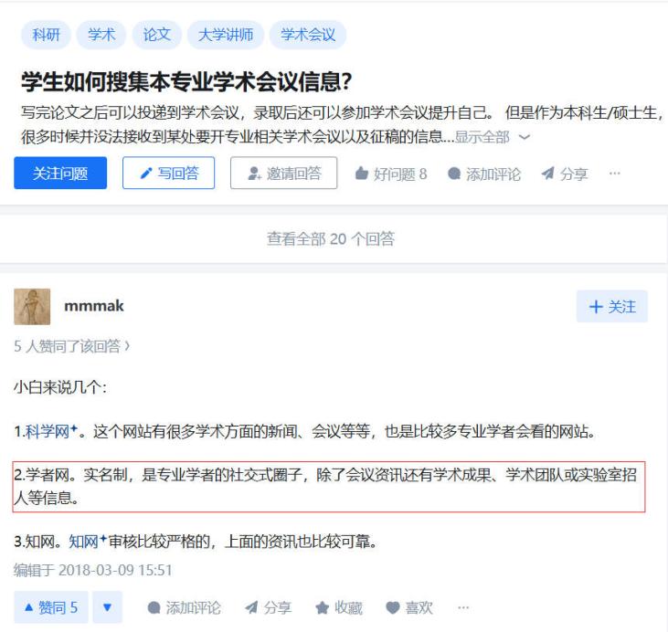 作為一個(gè)實(shí)名制的學(xué)術(shù)社交平臺(tái),學(xué)者網(wǎng)不僅提供學(xué)術(shù)會(huì)議信息,還集成了學(xué)術(shù)成果展示、學(xué)術(shù)團(tuán)隊(duì)招募、研究方向展示等功能,幫助科研人員高效鏈接學(xué)術(shù)資源。在 知乎 上,有用戶評(píng)價(jià)道:“實(shí)名制讓學(xué)術(shù)交流更真實(shí)、更可信,這是一個(gè)很有內(nèi)容、很有想法的學(xué)術(shù)社交平臺(tái)。” 在詢問如何搜集學(xué)術(shù)會(huì)議信息的帖子下,也有人推薦學(xué)者網(wǎng),認(rèn)為它是“專業(yè)學(xué)者的社交式圈子,不僅提供會(huì)議信息,還集成了成果展示和團(tuán)隊(duì)招募等功能”。