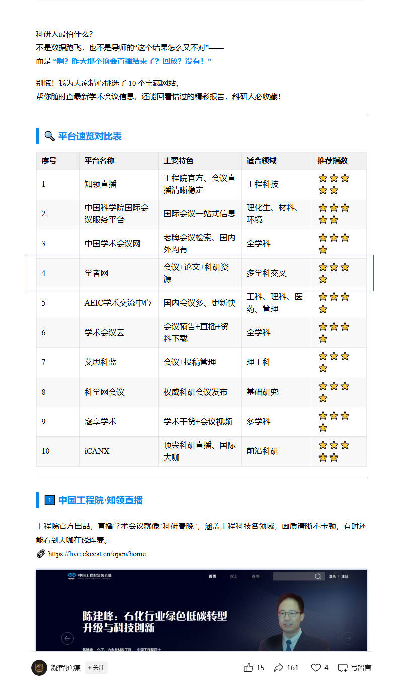 圖 9 國內(nèi)學(xué)術(shù)會(huì)議平臺(tái)盤點(diǎn)文章中對(duì)學(xué)者網(wǎng)的評(píng)價(jià)(來自https://mp.weixin.qq.com/s/qyWwAkc9AvFKK-kXZqc45w)