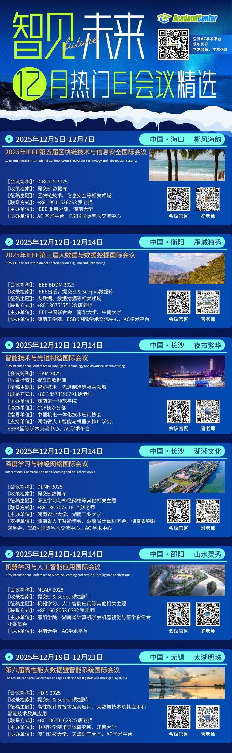 | 2025/12/12-14 | 衡陽 | 第三屆大數(shù)據(jù)與數(shù)據(jù)挖掘國際會議 |