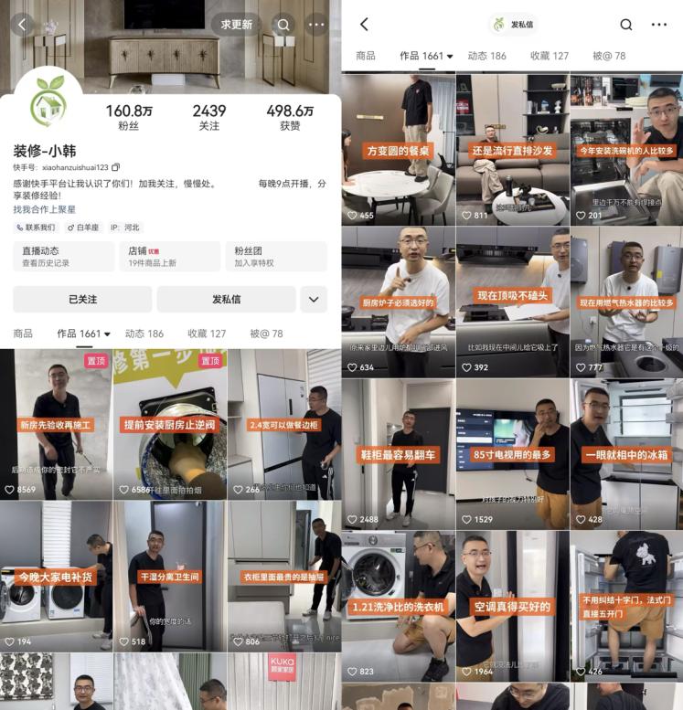 “2019年底,有位同行給我推薦了快手,說(shuō)有很多人在上面分享做過(guò)的案例,可以拿給客戶(hù)做參考”。在刷快手的過(guò)程中小韓發(fā)現(xiàn),“有些家居家裝的內(nèi)容質(zhì)量很不錯(cuò)”,但也有些人是在‘渾水摸魚(yú)’”。抱著分享真實(shí)裝修經(jīng)驗(yàn)的想法,小韓決定嘗試在快手創(chuàng)作些內(nèi)容,“也希望能引流線下,提高簽單率和利潤(rùn)”。