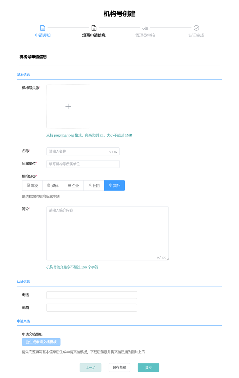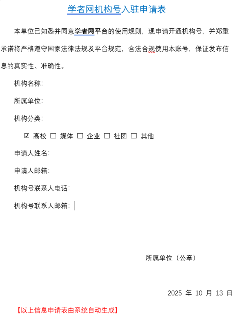 以往機(jī)構(gòu)號申請過程中,申請者常因提交材料格式不統(tǒng)一或內(nèi)容不符合要求而被駁回,影響入駐進(jìn)度。針對這一問題,新版機(jī)構(gòu)號推出了 “申請表模板生成”功能。申請人只需在線填寫基礎(chǔ)信息,系統(tǒng)即可自動生成規(guī)范的申請表。下載、蓋章并上傳后即可完成提交,既節(jié)省時間,又顯著提升了申請成功率。