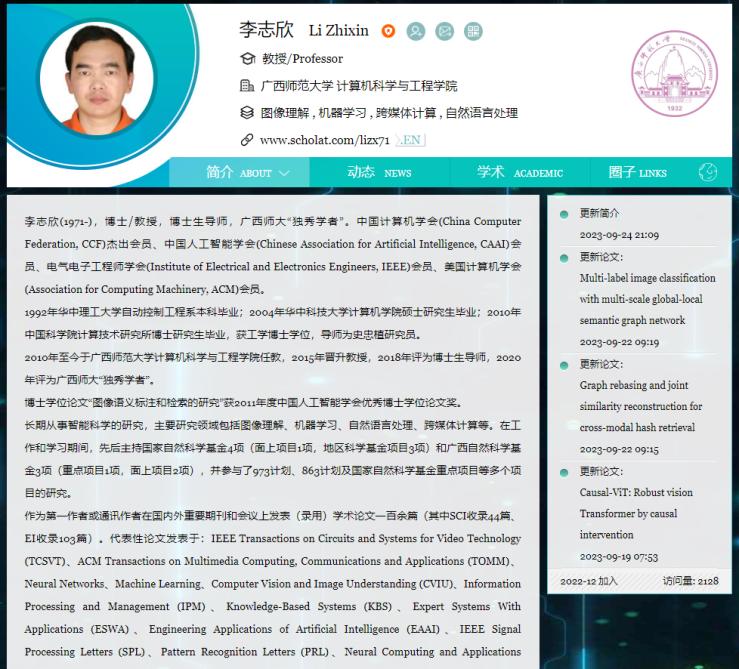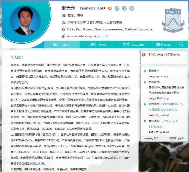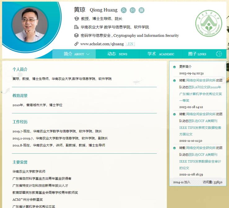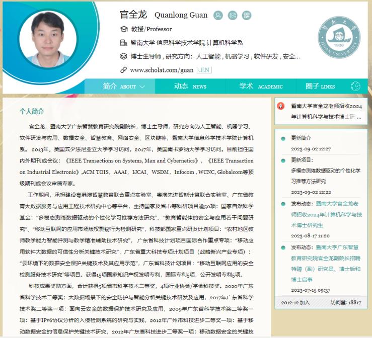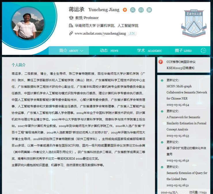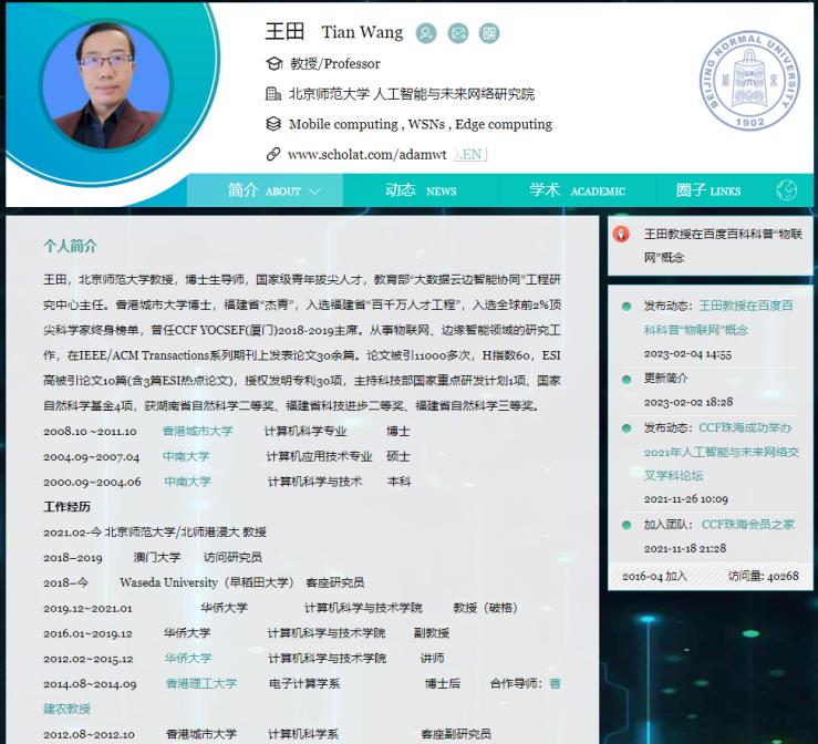 在新晉CCF杰出會員中的學者網(wǎng)用戶中,主要包括(1)具有豐富的個人信息;(2)在近兩年更新了最新學術信息,且最新學術成果發(fā)布于近兩年;(3)在近兩年發(fā)布過動態(tài)。下面是幾個示例: