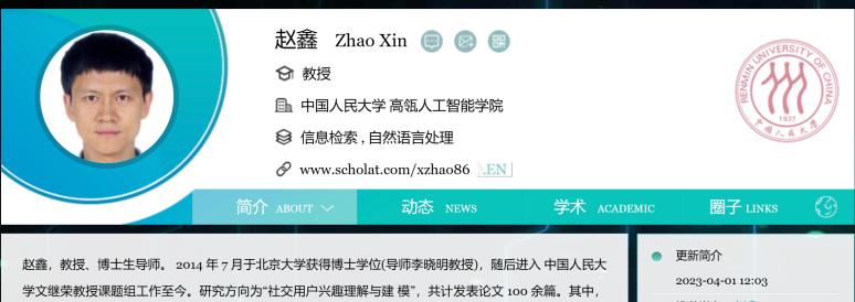 趙鑫,中國人民大學 高瓴人工智能學院 (scholat.com)