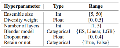 在上面的基礎(chǔ)上,PSEO將整個集成構(gòu)建過程形式化為一個超參數(shù)優(yōu)化問題。如表2所示,我們有六個決定集成行為的關(guān)鍵超參數(shù),PSEO采用貝葉斯優(yōu)化進行系統(tǒng)性尋優(yōu)。