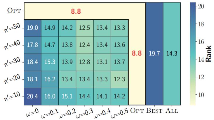 圖 2. 不同基模型選擇方案進行集成的平均測試集排名