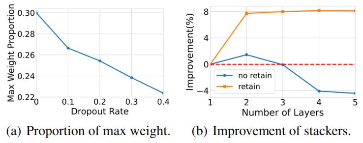 - 過擬合——指某些訓練損失極低的預測特征在訓練中占據(jù)主導地位,導致后續(xù)模型過度依賴而喪失泛化能力;解決方案:Dropout機制,借鑒神經(jīng)網(wǎng)絡(luò)的思想:對每個來自前一層的預測特征,基于其與訓練標簽的損失比值計算丟棄概率,訓練損失越低的特征越可能被隨機剔除,從而強制當前stacker從多樣化特征中學習。
