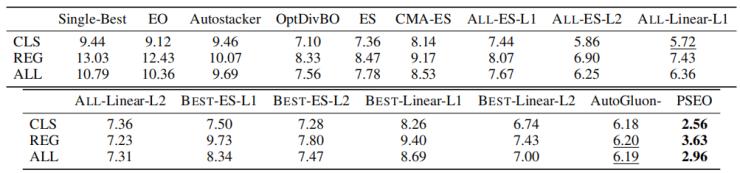 PSEO在80個OpenML真實數(shù)據(jù)集(50分類+30回歸)上,與16種方法對比,包括單最優(yōu)模型、3種單步集成學習方法、2種后驗集成選擇方法和9種現(xiàn)有AutoML的固定堆疊策略。