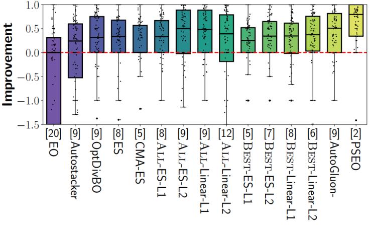 歸一化提升。 為進一步研究我們的結(jié)果,我們使用歸一化改進的箱線圖在圖4中可視化所有方法在80個數(shù)據(jù)集上的相對性能分布。PSEO的相對性能分布優(yōu)于所有基線。