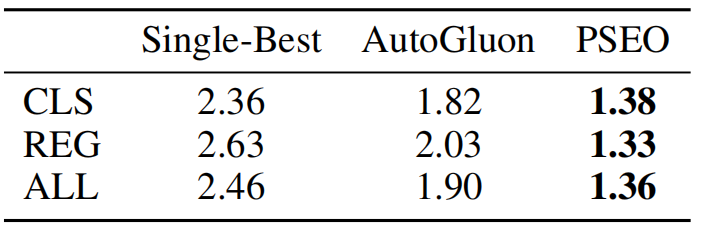 AutoGluon代表了具有多層堆疊的最先進AutoML系統(tǒng)。為更公平比較,我們復現(xiàn)了其搜索空間(包含108個帶優(yōu)先級的零樣本模型)。我們使用AutoGluon訓練基模型最長1小時,然后比較其與PSEO的集成算法。表4展示了在80個數(shù)據(jù)集上的平均測試排名。我們可以發(fā)現(xiàn)PSEO最優(yōu),平均排名為1.36。 綜上所述,PSEO在兩個系統(tǒng)(VolcanoML和AutoGluon)產(chǎn)生的候選池上取得持續(xù)成功,凸顯了其魯棒性和廣泛適用性。