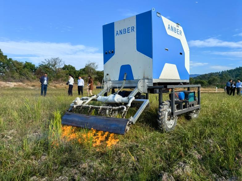 廣東省農(nóng)業(yè)科學(xué)院植物保護(hù)研究所田興山研究員團(tuán)隊(duì)研發(fā)的新型自走式火焰除草車在田間展示除草機(jī)理。