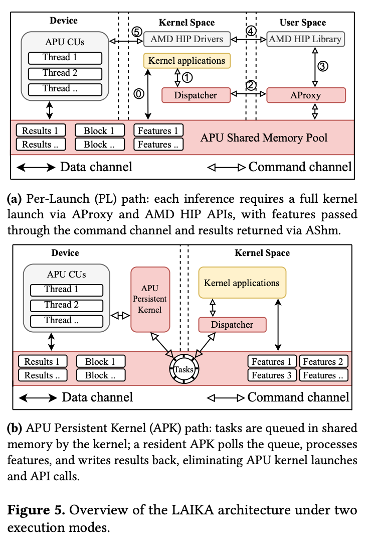 該論文第一作者為計(jì)算機(jī)學(xué)院2024級(jí)碩士研究生卓浩銘,計(jì)算機(jī)學(xué)院李丁丁教授為指導(dǎo)老師,林榮華副研究員與湯庸教授為共同作者。論文提出LAIKA框架,針對(duì)集顯架構(gòu)(APU)特性,設(shè)計(jì)了跨內(nèi)核態(tài)、用戶態(tài)與設(shè)備態(tài)的三域共享內(nèi)存機(jī)制(AShm),實(shí)現(xiàn)了真正的“零拷貝(Zero-Copy)”數(shù)據(jù)傳輸,并結(jié)合持久化內(nèi)核(APK)技術(shù)消除了啟動(dòng)開銷。實(shí)驗(yàn)表明,該方案在無需昂貴專用設(shè)備的前提下,將端到端推理延遲降低了9.7倍,且整機(jī)功耗僅為獨(dú)立顯卡方案的28.9% 。這一成果為構(gòu)建高效、綠色的計(jì)算系統(tǒng)提供了全新思路。