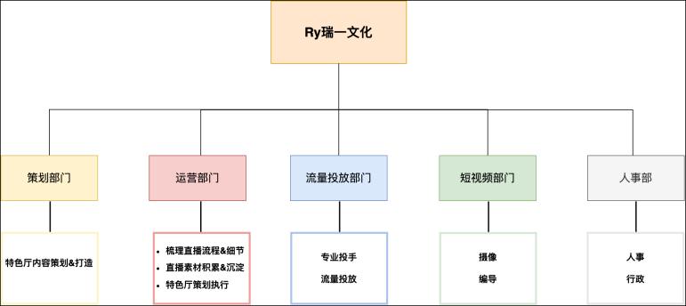 策劃部門主要負(fù)責(zé)特色廳的內(nèi)容策劃,做好內(nèi)容創(chuàng)新。此外,我們還有專門的流量投放部門,助力主播篩選與培養(yǎng)。短視頻部門有專業(yè)的編導(dǎo)和攝像,通過(guò)短視頻完善主播人設(shè)的打造。