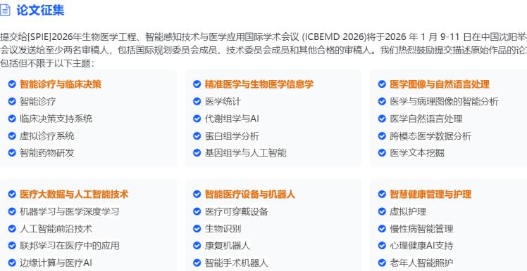 [SPIE]2026年生物醫(yī)學(xué)工程、智能感知技術(shù)與醫(yī)學(xué)應(yīng)用國(guó)際學(xué)術(shù)會(huì)議 (ICBEMD 2026)