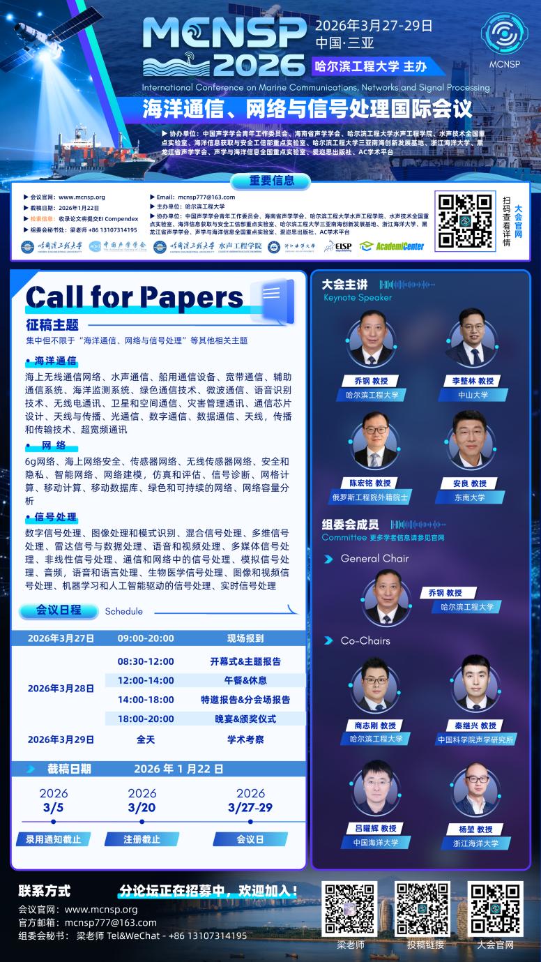 會(huì)議名稱(chēng):海洋通信、網(wǎng)絡(luò)與信號(hào)處理國(guó)際會(huì)議 (MCNSP 2026)