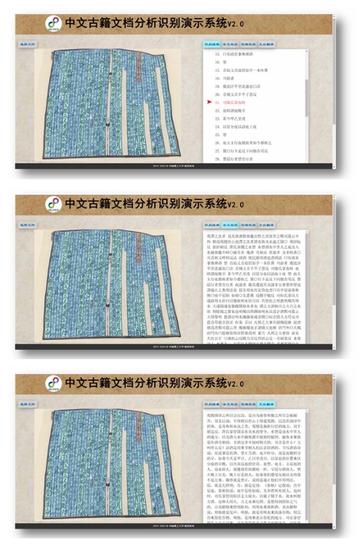 金連文教授團隊還開發(fā)了業(yè)內(nèi)先進的古籍文檔分析與識別系統(tǒng),集成了該團隊自主研發(fā)的古籍句讀(自動標點)和文本翻譯兩大功能。用戶只需提供一張古籍圖片,系統(tǒng)便能自動識別并定位其中所有的文本,將識別出的文本按照正確的閱讀順序排序,添加標點符號并翻譯為現(xiàn)代文,便于閱讀。